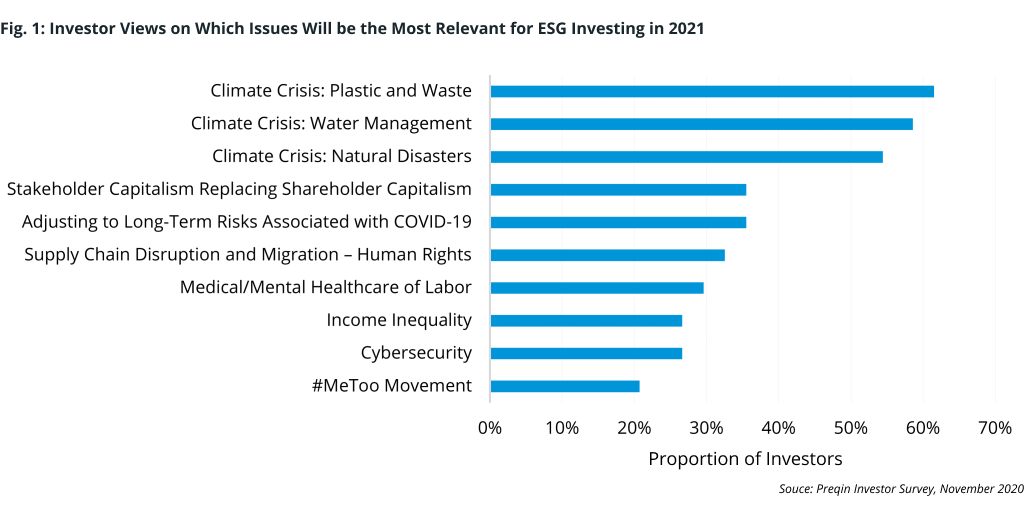 The climate crisis is the number-one concern relevant to ESG investing this year, according to Preqin’s latest investor survey. At least 54% of respondents (Fig. 1) said that plastic and waste management, water management, and natural disasters specifically will be top of mind in 2021, ahead of the impact of COVID-19 and high-profile social issues such as income inequality and political strife.