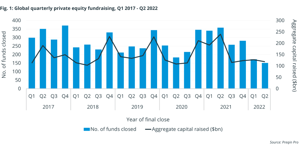 There’s been a market sell-off among LPs on the public market side, leaving them to rebalance their portfolios by adjusting their private market exposure. As a result of this and the risk-off sentiment encouraged by rising inflation, the number of funds closing and aggregate capital raised has declined sharply. Private equity fundraising dropped 50.5% by value and 57.8% by number of funds closed in Q2, compared with the same period last year.