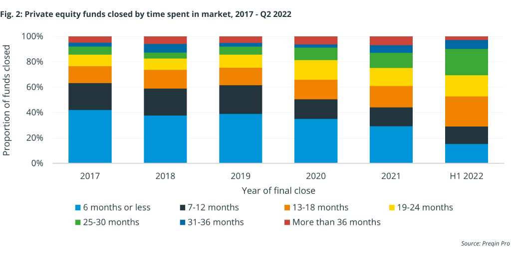 Funds that closed in the first half of 2022 had been on the road for longer on average compared with funds closing in previous years. This suggests that the poor fundraising environment may have prompted some funds to close sooner than they otherwise would have.