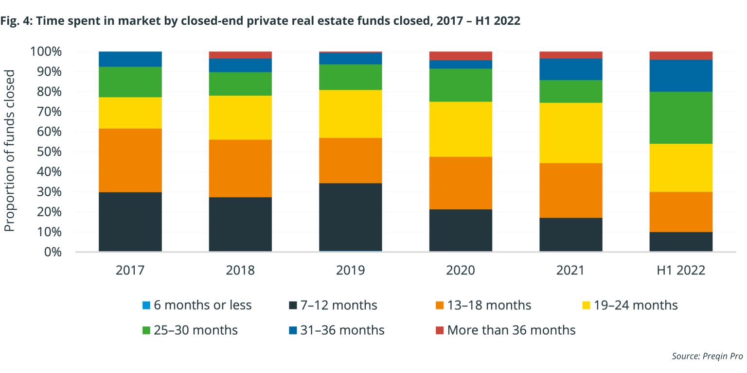 It's far from plain sailing for real estate fund managers of any level that have been spending longer on the road over the past two years. By the end of Q3 2021, 23% of funds closed had spent more than two years on the road, while the average time spent in market during the first three quarters of 2021 was 18.5 months.