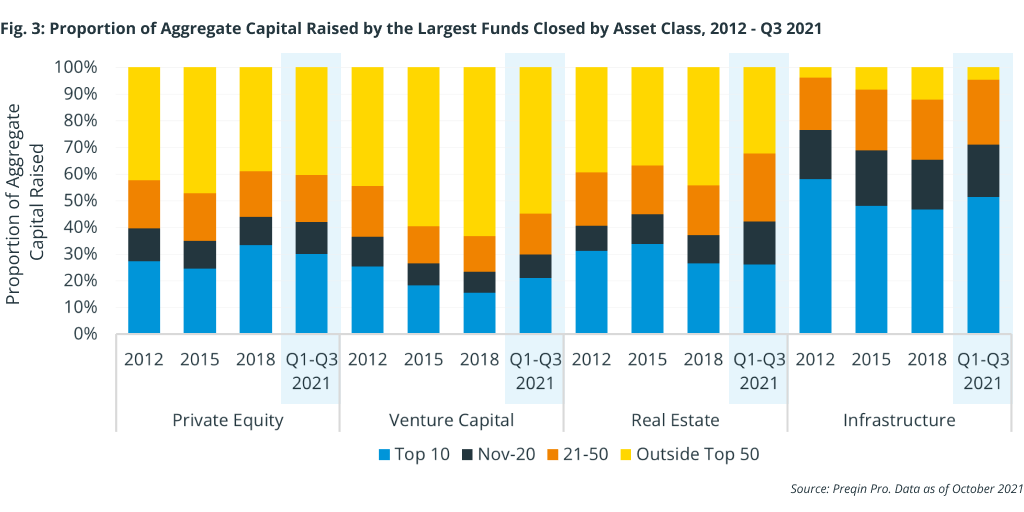 We’ve seen a longer-term trend of investors looking to build on existing relationships with managers rather than establish new ones. This has implications for new managers’ ability to raise, and, in the longer term, feeds fundraising concentration.