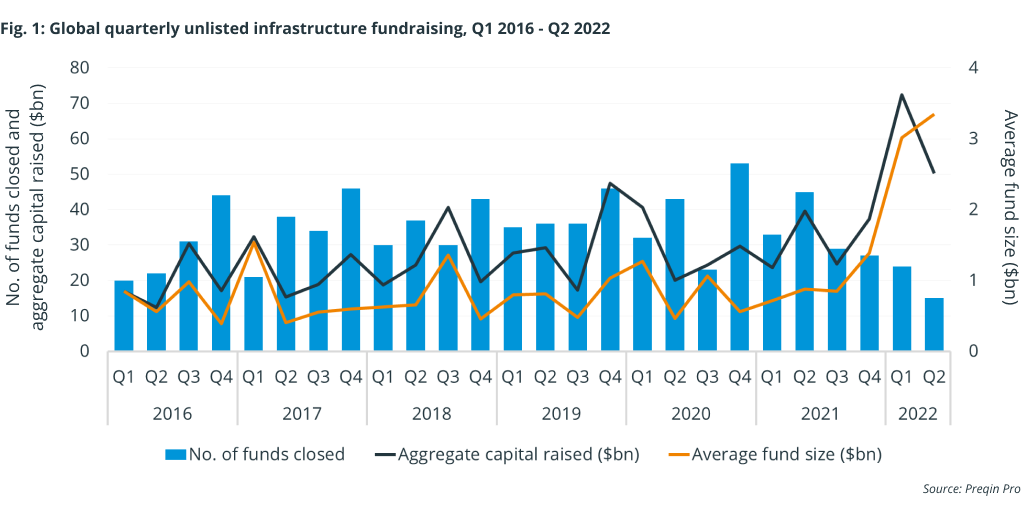 Aggregate capital raised over Q2 2022 reveals another stellar quarter of fund closings, at least in terms of size (Fig. 1). If Q1 this year had not delivered a clear record, with just 24 funds closing but raising a combined $72bn (52% higher than the previous record in Q4 2019), Q2 would have taken the title. However, with this quarter seeing $50bn raised by just 15 funds tracked so far, it’s a safe second place in a high-paced market. This concentration of capital is driving average fund sizes for the year to well over $3bn.
