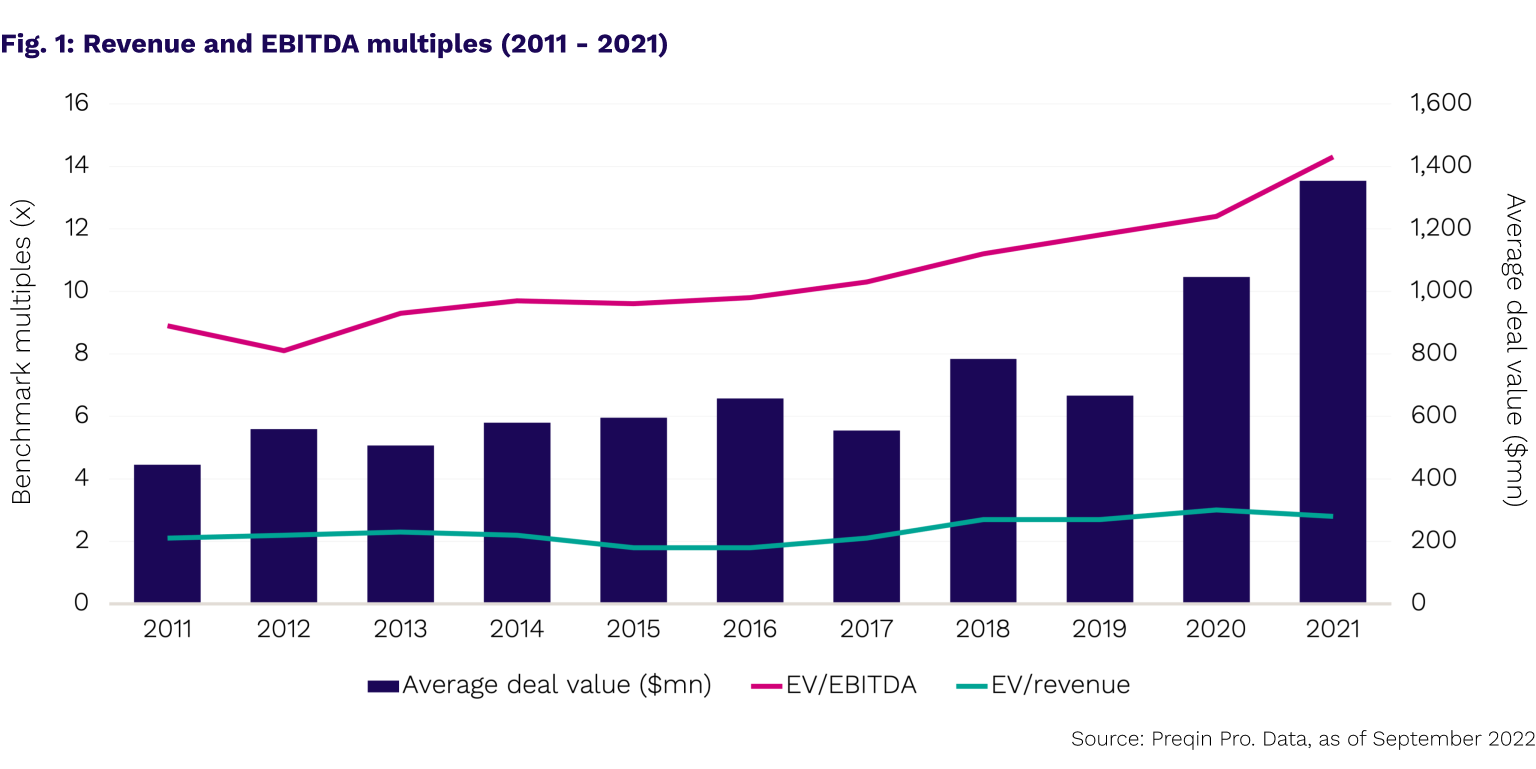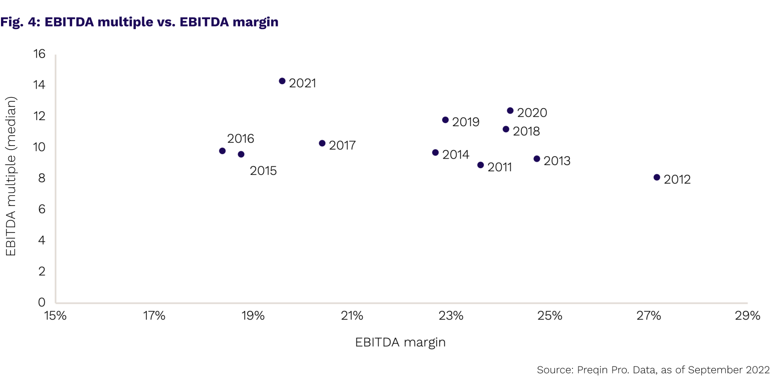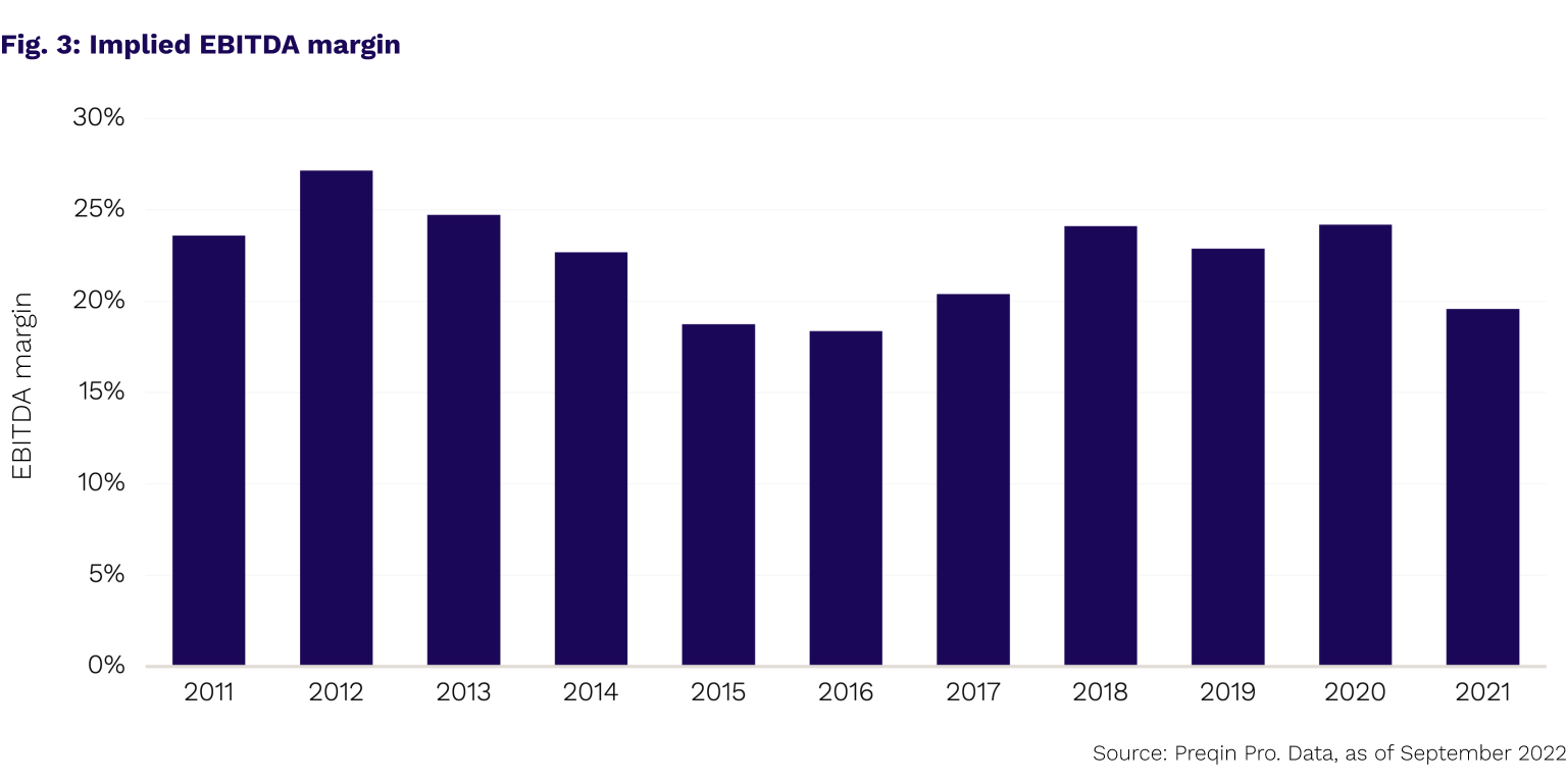 Here’s what the data tells us. Using Preqin's Asset-Level Benchmarks, we can calculate revenue and earnings or EBITDA multiples over the 10 years to 2021. Fig. 1 shows that, while the ratio of enterprise values to revenue has remained fairly stable over the past decade, the ratio of enterprise values to EBITDA has risen sharply in recent years. As recently as 2017, buyout funds were paying a median of 2.1x revenues and 10.3x EBITDA for assets. Fast forward to 2021, and while the EV/Revenue figure has shown a modest increase to 2.8x – the median EV/EBITDA multiple has jumped to 14.3x.