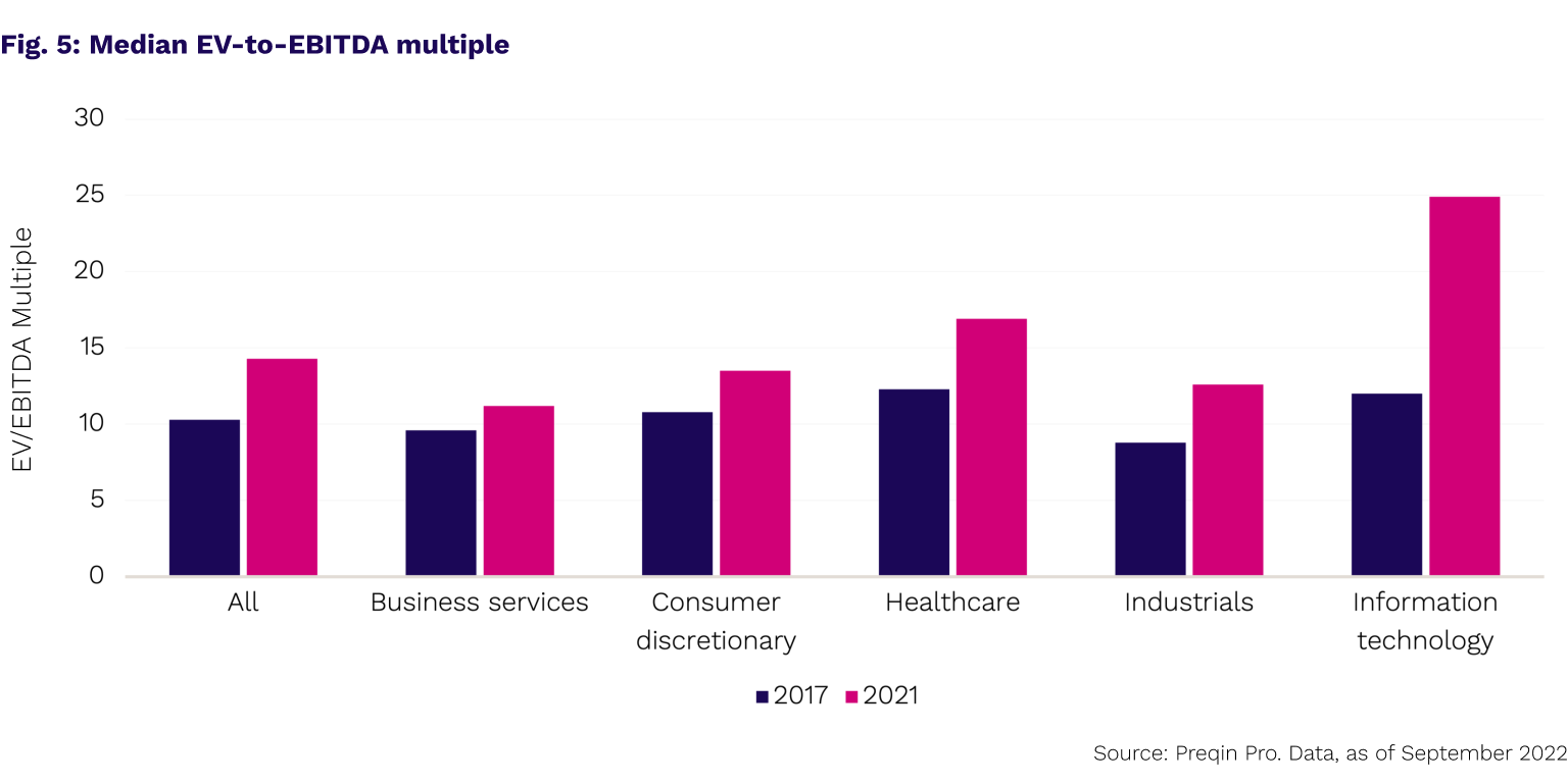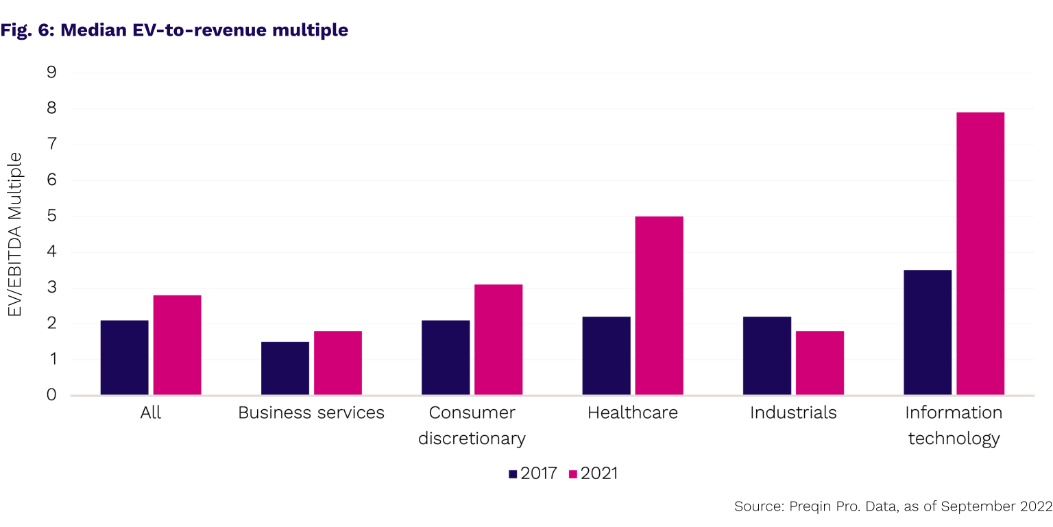 The increase in prices for assets has been especially significant in sectors such as technology. Between 2017 and 2021 the median EV-to-revenue multiple for tech buyout deals soared to 7.9x, up from 3.5x (Fig. 5). The rise in EBITDA multiples was even greater – median EV-to-EBITDA skyrocketed to more than 24x earnings, up from 12x just five years before.