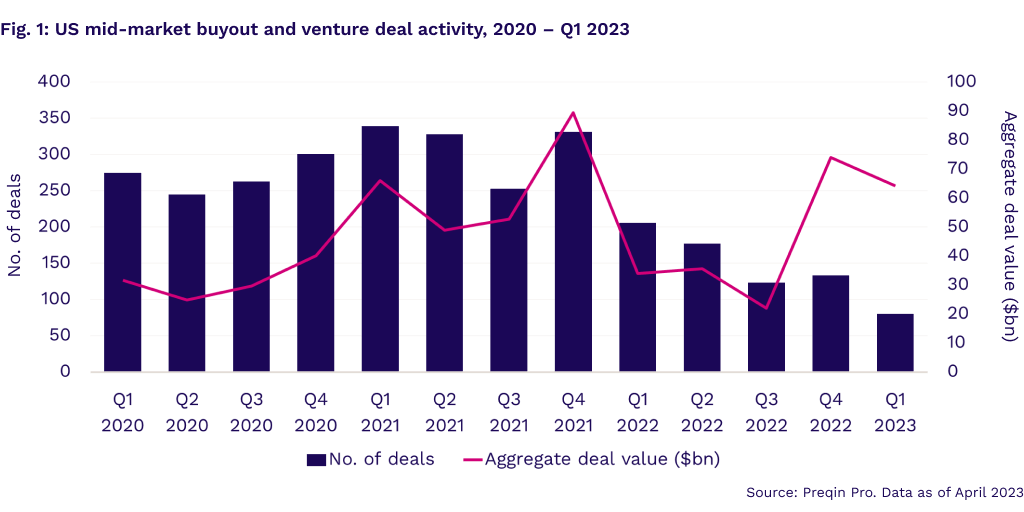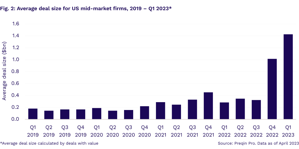 The aggregate value of US mid-market buyouts and venture capital (VC) deals surged in the fourth quarter of 2022, up 237% compared with the previous quarter to reach $74.1bn. This marks the second-best quarterly performance in the last decade (Fig. 1). The momentum carried over into the first quarter of 2023, with an aggregate deal value of $64.2bn across 80 deals. Despite being the lowest deal volume in a decade, the high aggregate deal value meant that average deal size hit an historic high of $1.4bn, surpassing the previous quarter’s record of $1bn (Fig. 2).