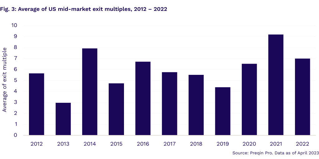 The exit environment in the US mid-market sector has been robust, hitting an all-time high exit multiple of 9.18 in 2021, the most active year for deals over the past decade. Although the exit multiple fell to 7 in 2022, it was still above the 10-year average of 6.25x, indicating healthy returns for investors (Fig. 3).