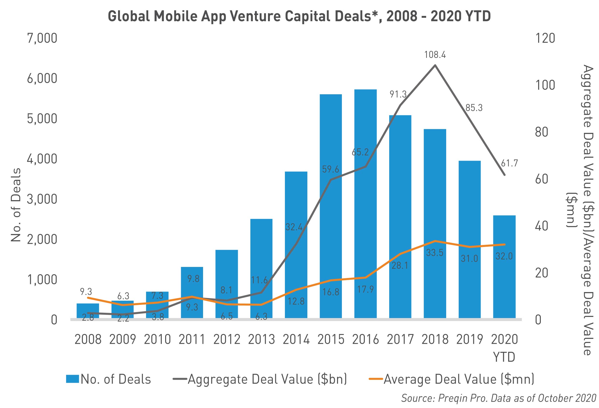 Apple unveiled four shiny new 5G-enabled iPhones at its launch event on 13 October. The California-based tech giant’s 2020 models offer faster download and upload speeds through 5G compatibility and more powerful hardware. Tim Cook, Apple’s CEO, said that iPhone 12 "provides a new generation of performance." These upgrades will allow mobile app users and developers to expand further in the already flourishing world of mobile apps. We use data from Preqin Pro to look at the key role venture capital funding has played in mobile app development in recent years.