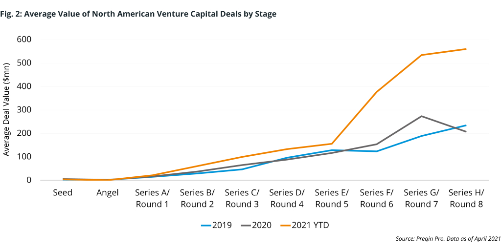 As investors loosened the purse strings, the risks they were willing to take became clear. Late-stage investments were favored compared to riskier early rounds. Cash outlays between the seed stage and third round were up roughly 62% from their 12-quarter average, while the later rounds saw a 165% increase in activity (Fig. 2). Later-round deals generally see larger investments in established portfolio companies. Early rounds, however, are smaller in size and larger in number with the investor expecting to hit on some of their bets, but the first quarter saw a significantly greater bifurcation. In dollar terms, the average round-eight financing was $539mn higher than first round, up from $190mn in 2019, and $220mn in 2018.
