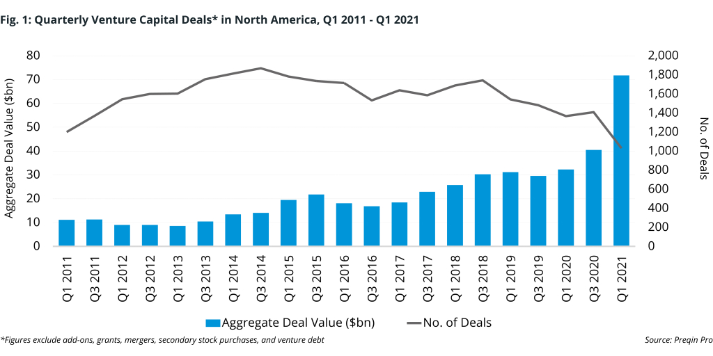 North American venture capital was strong off the blocks in the first quarter of 2021, with more than $71bn (Fig. 1) in funds deployed, already half of 2020’s total. But why now? Perhaps investors are betting on a US economic recovery to pre-pandemic levels, or maybe even stronger.