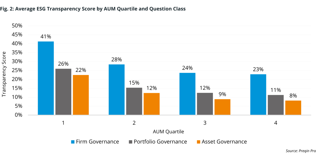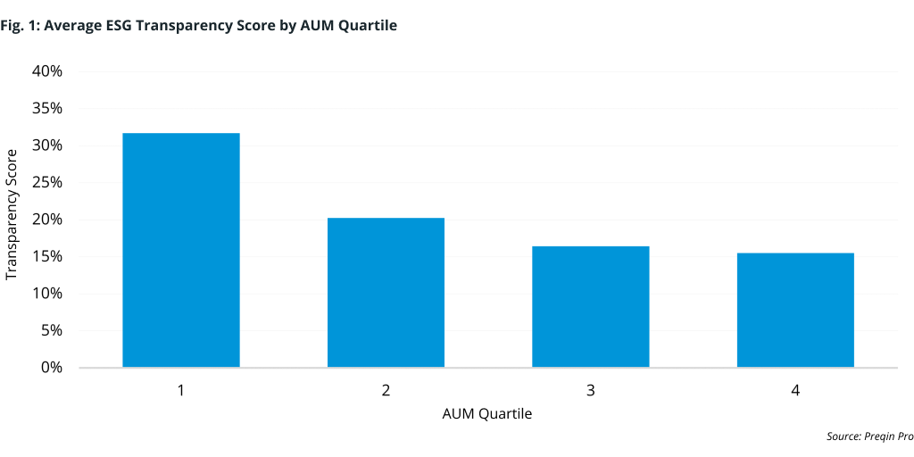 When we analyze transparency scores by assets under management (AUM), the greenwashing question emerges once again. Preqin collected data on 1,600 private capital GPs, representing more than $6.83tn in total AUM. As Fig. 1 shows, managers’ commitment to ESG fades as AUM declines, implying that greenwashing could be occurring at smaller firms.
