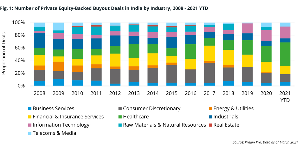As shown in Fig. 1, the largest proportion of buyout deals in India tracked by Preqin in 2020 were healthcare deals, spanning the pharmaceuticals, chemicals, and biotech industries. Some $2.4bn was invested across 31 healthcare deals in 2020, up from $1.1bn invested across 24 deals in 2019.