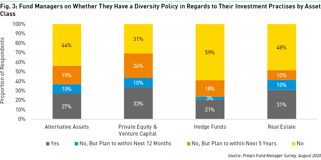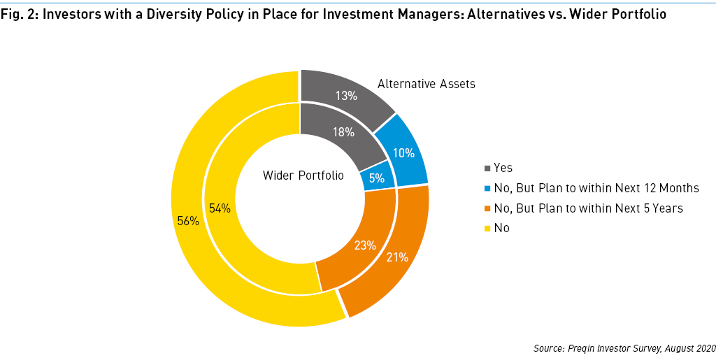 Research by Preqin has shown that more than three-quarters of total assets across the alternatives industry are managed by GPs with confirmed policies in place for diversity and inclusion. In other words, the largest GPs are already anticipating that the diversity agenda will gather momentum in the years to come, and are striving to position themselves as thought-leaders in this space.