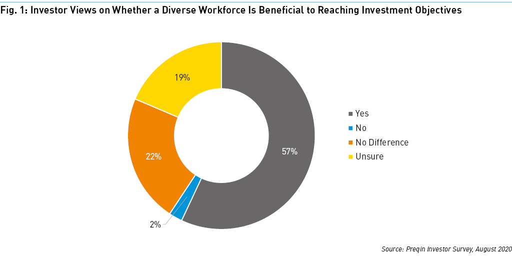 A majority of the alternative investment community recognizes that diversity of gender, experience, and cultural backgrounds in the workplace is a powerful defense against groupthink, can sharpen a team’s decision-making ability, and improves investment outcomes. However, 19% of investors surveyed for Future of Alternatives 2025 remain ambivalent about the benefits of a diverse workforce, while 22% believe that a diverse workforce makes no difference to reaching investment objectives (Fig. 1).