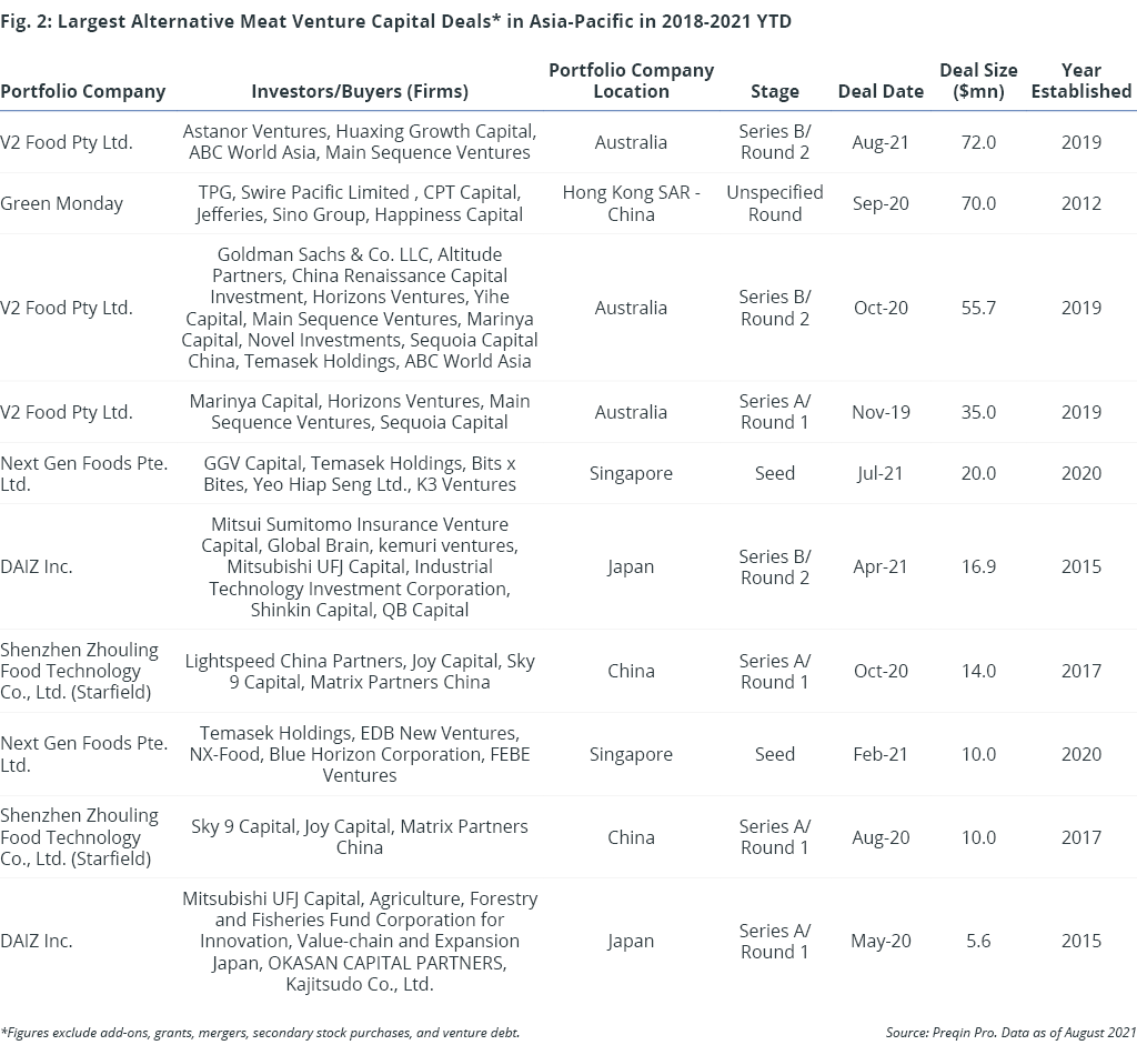 Several large deals have been completed in recent years. Notably, Australian alternative meat company v2food has just closed a Series B funding round worth $72mn this month, raising its value to $500mn (Fig. 2). The funding round is the largest for an Asia-Pacific alternative meat company, and was led by Astanor Ventures, China Renaissance Capital Investment, and Main Sequence Ventures. The funds will be used to develop new products and for overseas expansion in Europe and China. Previously, the company raised $55mn in October 2020, led by Goldman Sachs, China Renaissance, and Temasek Holdings.