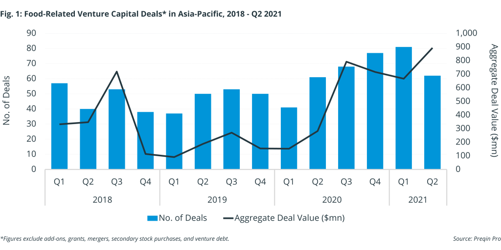 Food-related venture capital deals in Asia-Pacific reached record levels in Q1 2021, crossing $900mn in aggregate value, as Fig. 1 shows. Most of the largest transactions in the past three years have been for assets in the fresh foods and grocery supply chain. However, Preqin data is recording a new wave of deals in the niche segment of alternative meat. Alternative proteins – typically made of soy, pea, or fungi protein – are designed to emulate the texture and taste of meat, and can be used in conventional dishes such as ‘beef’ burgers and ‘chicken’ tenders.
