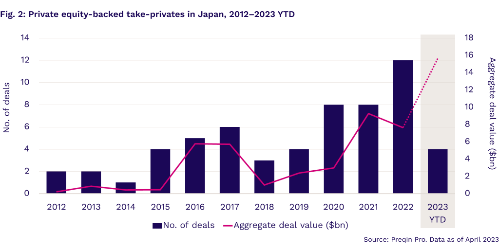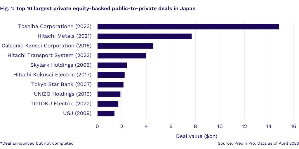A consortium led by Japan Industrial Partners to acquire Toshiba for $15.3bn (JPY 2tn), if accepted, will be the largest take-private deal in the country's history, over doubling the previous record of such deals in 2021 (Fig. 1).