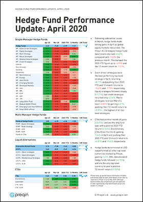 Following substantial losses in March, hedge funds made strong gains in April as global equity markets rebounded. The Preqin All-Strategies Hedge Fund benchmark returned +6.42%, compared with -9.20% the previous month. CTAs had another month of gains (+0.65%) and are the only fund type with a positive 2020 YTD return (+2.06%).
