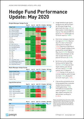 The Preqin All-Strategies Hedge Fund benchmark returned +2.89% in May as global markets began to regroup, reducing 2020 YTD losses to 2.95% and bringing the 12-month return to +1.80%. North America-focused hedge funds posted the highest May return (+4.36%) of any top-level region. In contrast, funds focused on Europe returned +1.34%.
