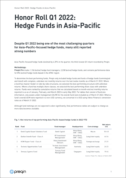 Q1 2022 was a challenging quarter for Asia-Pacific-focused hedge funds, with the asset class declining 4.29%. In spite of the challenges, many funds still reported strong numbers.