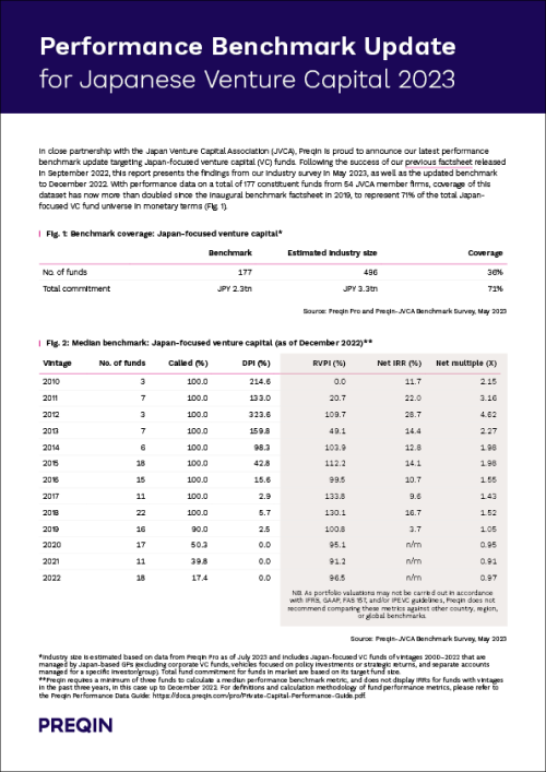 In close partnership with the Japan Venture Capital Association (JVCA), Preqin is proud to announce our latest performance benchmark update targeting Japan-focused venture capital (VC) funds. Following the success of our previous factsheet released in September 2022, this report presents the findings from our industry survey in May 2023, as well as the updated benchmark to December 2022. With performance data on a total of 177 constituent funds from 54 JVCA member firms, coverage of this dataset has now more than doubled since the inaugural benchmark factsheet in 2019, to represent 71% of the total Japan-focused VC fund universe in monetary terms.