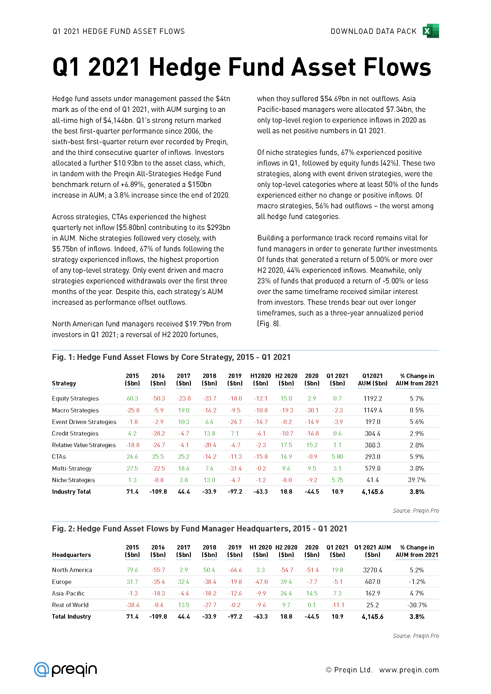 In this factsheet, we present hedge fund asset flow data for Q1 2021, including breakdowns by strategy, region, past performance, and fund size.
