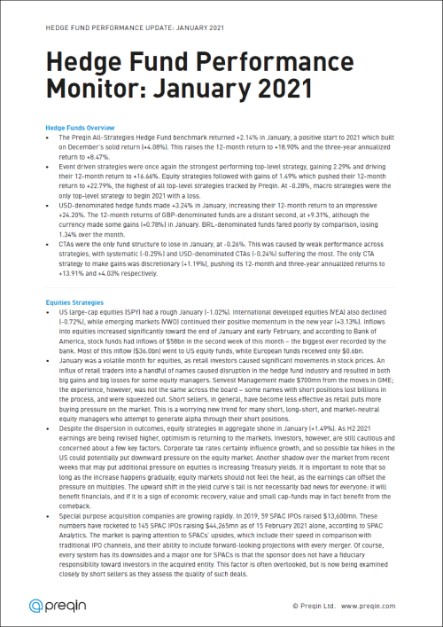 The Preqin All-Strategies Hedge Fund benchmark returned +2.14% in January, a positive start to 2021 which built on December’s solid return (+4.08%). This is in spite of significant movements in stock prices caused by retail investors, fiscal stimuli, rising Treasury yields, and unemployment across the globe.