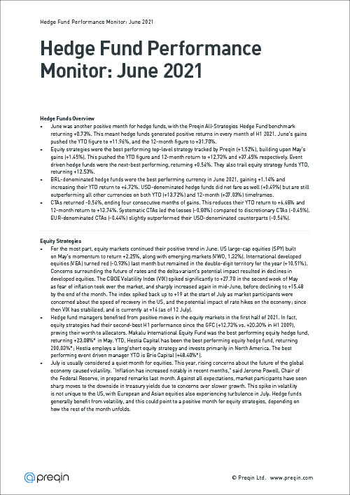 The Preqin All-Strategies Hedge Fund benchmark gained 0.73% in June, meaning single-manager hedge funds have generated positive returns in every month of H1 2021. June's gains pushed the YTD return to +11.96% and the 12-month return to +31.70%.