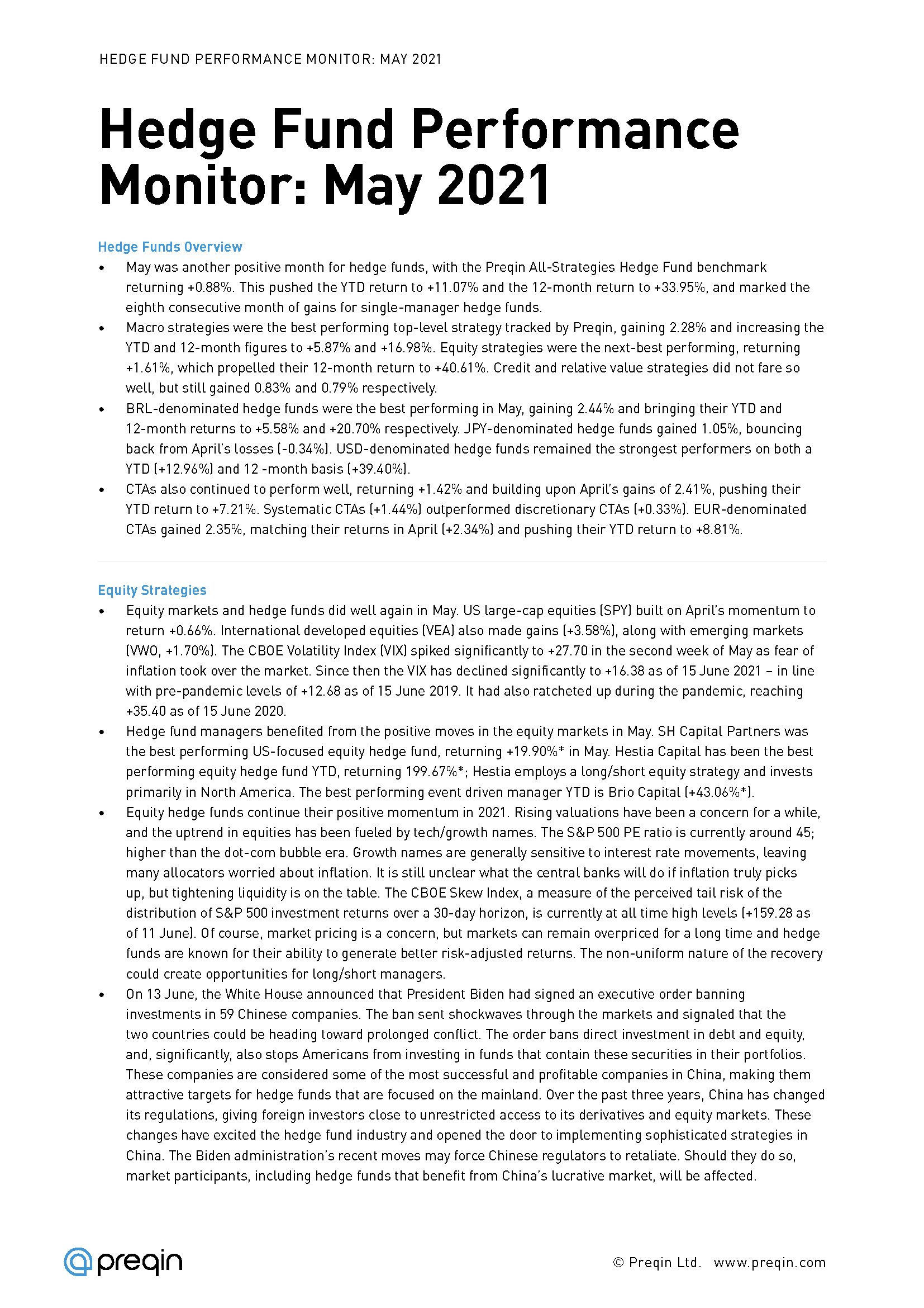 The Preqin All-Strategies Hedge Fund benchmark gained 0.88% in May, marking the eighth consecutive month of gains for single-manager hedge funds. This pushed the YTD return to +11.07% and the 12-month return to +33.95%.