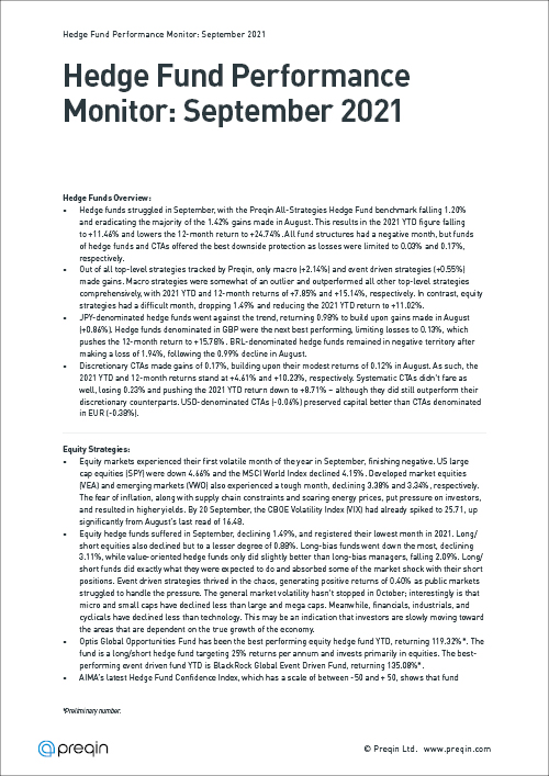After a strong August, hedge funds performed poorly in September. The Preqin All-Strategies Hedge Fund benchmark dropped 1.20% to wipe out most of the gains it recorded the previous month.