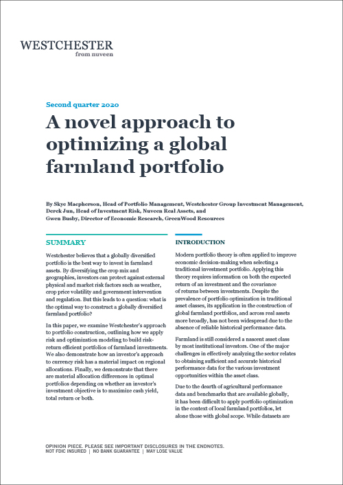 Westchester Group Investment Management, an investment specialist of Nuveen, believes that a globally diversified portfolio is the best way to invest in farmland assets. By diversifying the crop mix and geographies, investors can protect against external physical and market risk factors such as weather, crop price volatility, and government intervention and regulation. But this leads to a question: what is the optimal way to construct a globally diversified farmland portfolio?