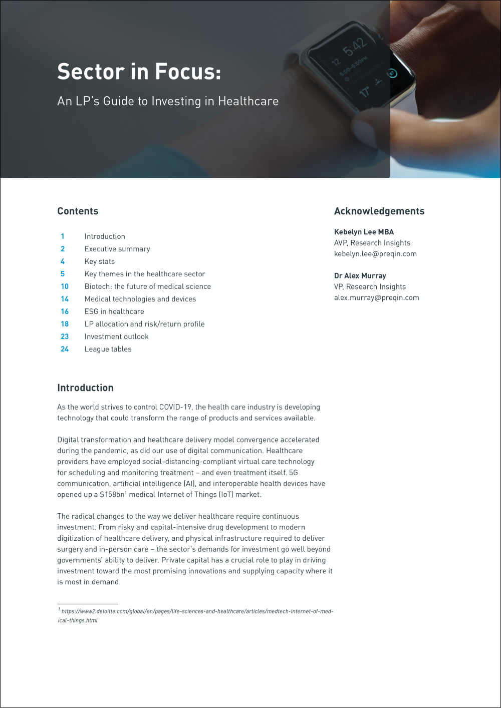 To help you understand how innovations in remote scheduling and delivery of services and treatment are creating investment opportunities, we have created Sector in Focus: An LP’s Guide to Investing in Healthcare. You will learn how biotech and new medical devices use artificial intelligence and digital communication to enable drug development and digital healthcare delivery, and how physical infrastructure for surgery and in-person care is being transformed. We also analyse the potential to broaden access to healthcare services.